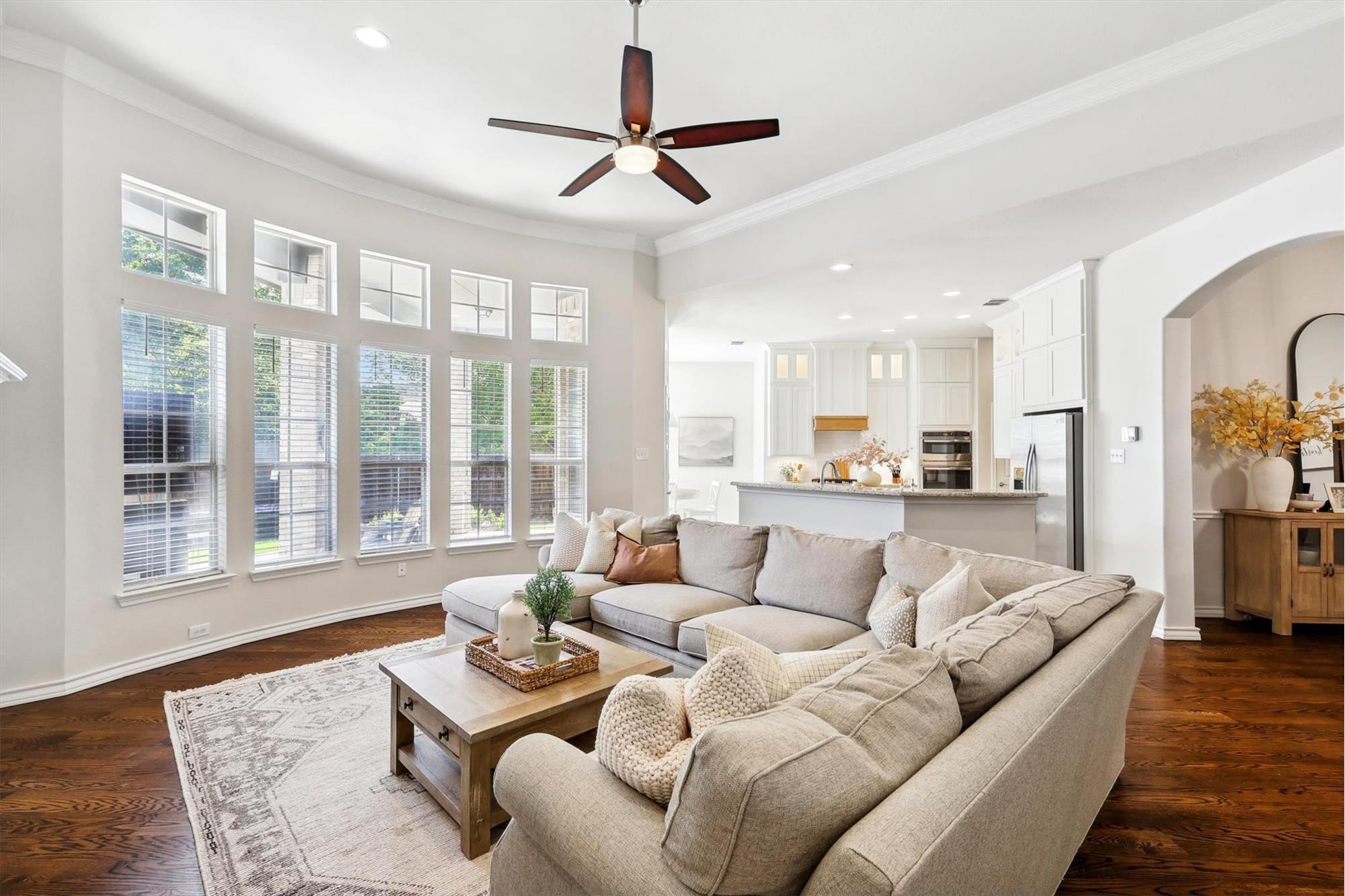 This gem is located in SE Flower Mound on an oversized corner lot with mature trees. Open floor plan filled with natural lighting and four spacious bedrooms. The gourmet chef's kitchen features top-of-the-line stainless steel appliances, custom cabinetry, and granite countertops. Recently renovated guest bath with quartz countertops. Huge upstairs game or media room with a wet bar is located above the oversized garage equipped with ample storage space and vaulted ceilings with room for a car lift or additional storage space. Step outside to a meticulously manicured lawn with a spacious patio.