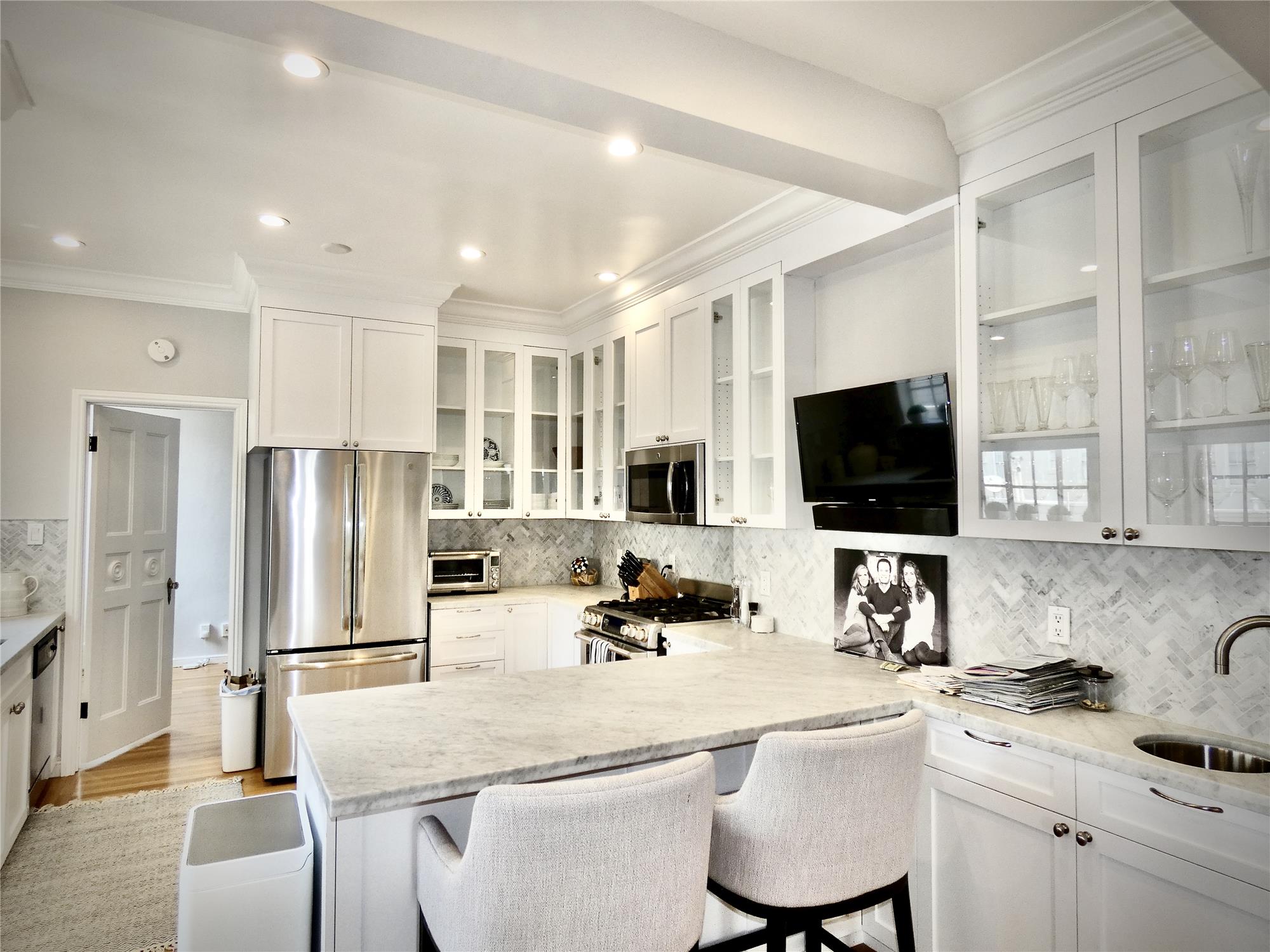 Magnificent hand crafted, plaster moldings throughout. Devine sized rooms with tall ceilings. Huge windows in all 7 rooms of the apartment, which includes a massive living room with glorious, high ceilings; a formal open dining room; open plan HUGE remodeled, marble kitchen with eat up counter. Perfect for entertaining! Wet Bar. 3 well separated bedrooms. REMODELED, MARBLE Kitchen has STAINLESS GAS STOVE, LG FRIG. MICROWAVE AND DISHWASHER. Abundant walk in closets. Ensuite Washer/Dryer as well as additional machines in laundry room.
