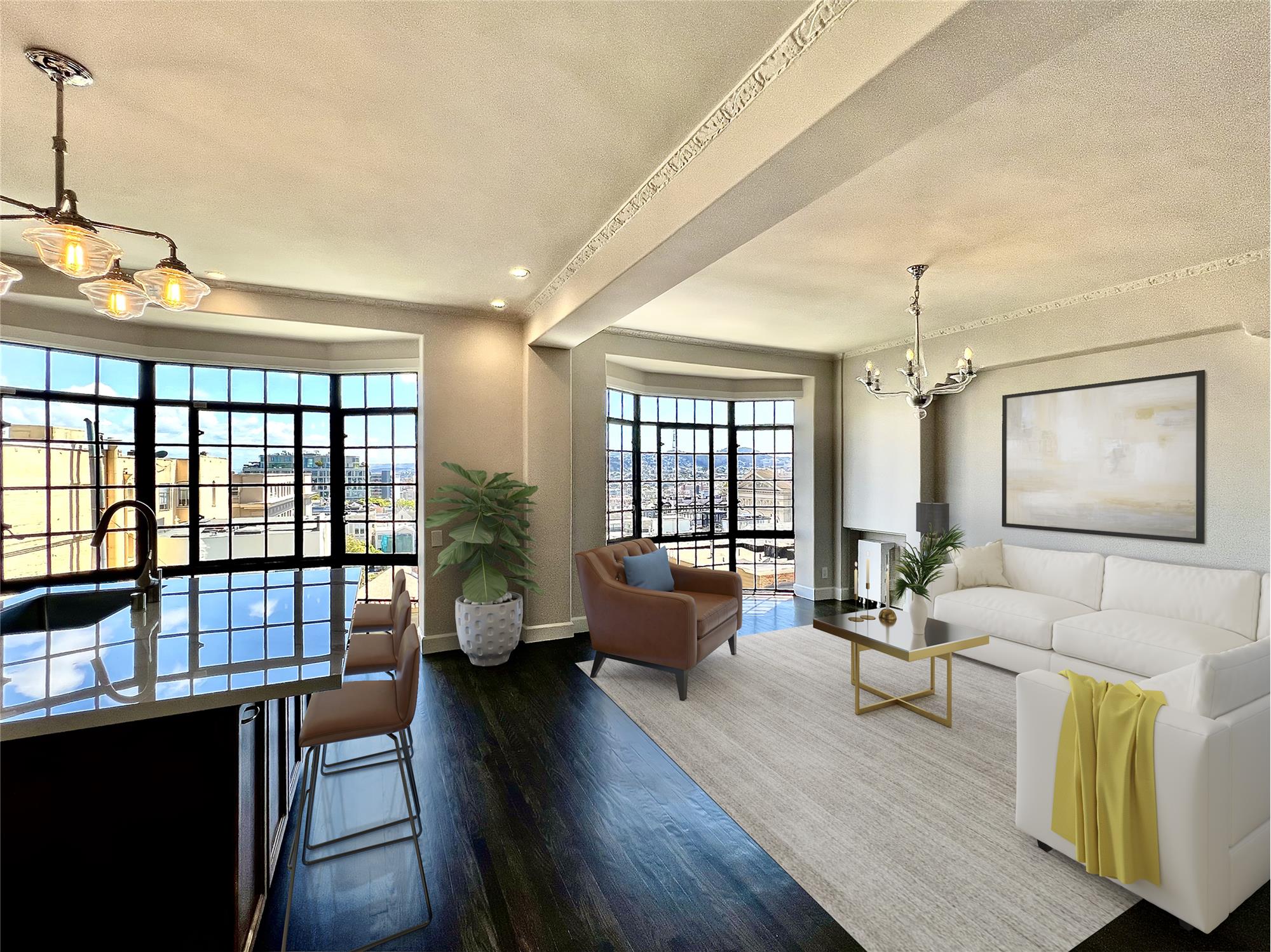 Beautiful, designer remodel in iconic location Classic Pacific Heights Art Deco building designed by famous Art Deco architect Grosvenor-Bowles. Family owned and managed property. TOP FLOOR, large 3br, 2.5 bathrooms, PENTHOUSE. Open plan, modern living room/ kitchen / dining area with spectacular, steel framed, historic windows. Remodeled kitchen featuring custom made cabinets, Cesar stone counter tops, Viking GAS stove, 2 stainless steel refrigerators, dishwasher, hood and garbage compactor. MASSIVE island with space for several bar stools.