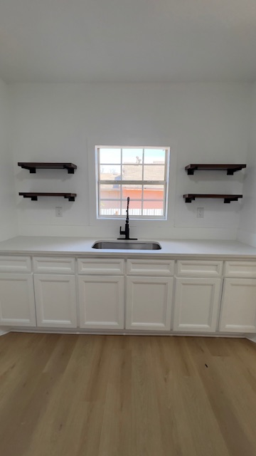 - Kitchen equipped with stainless steel fridge, stove, and floating shelves