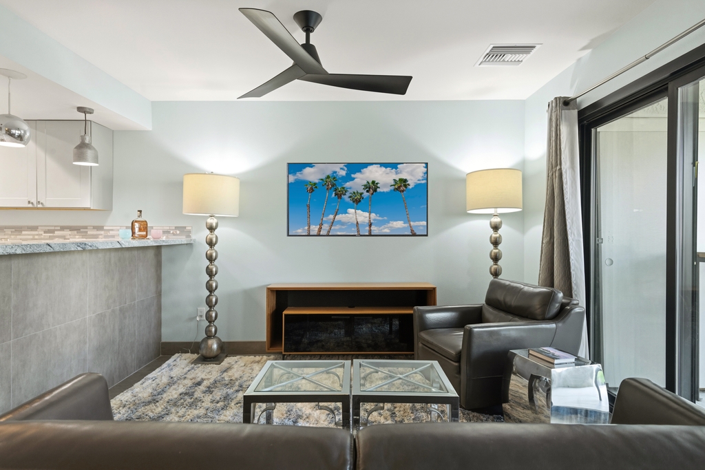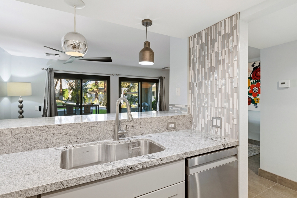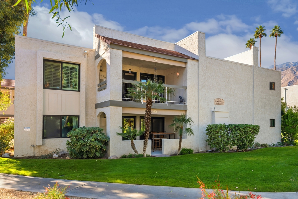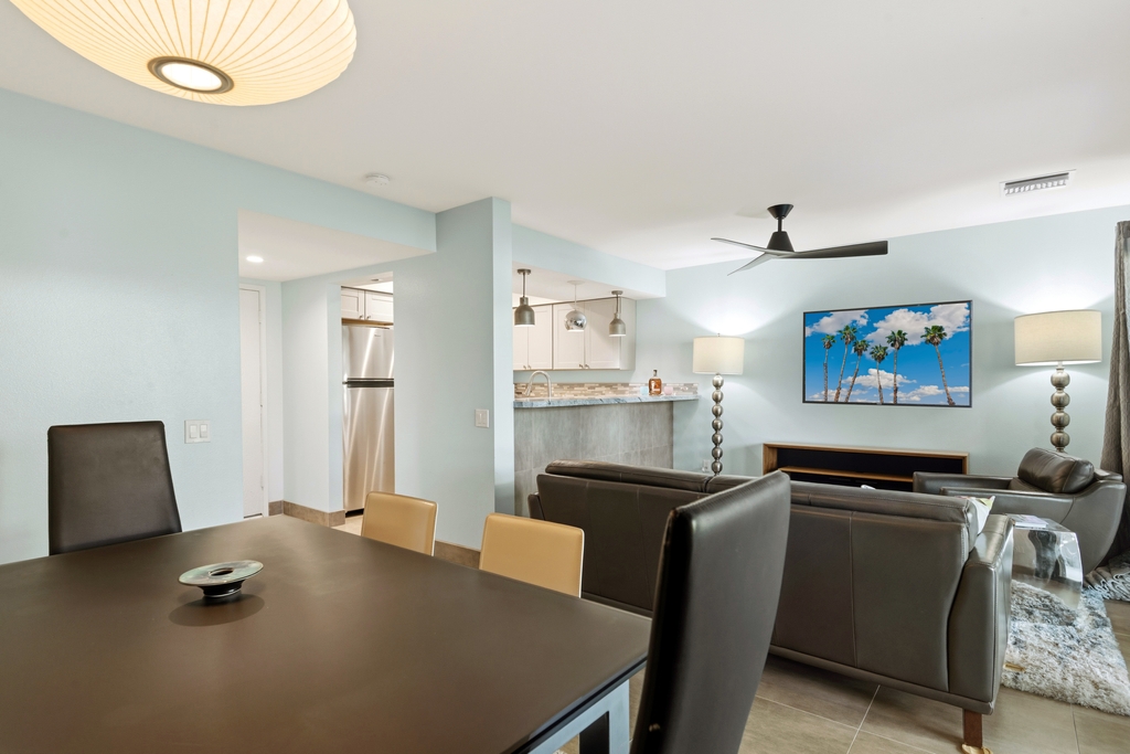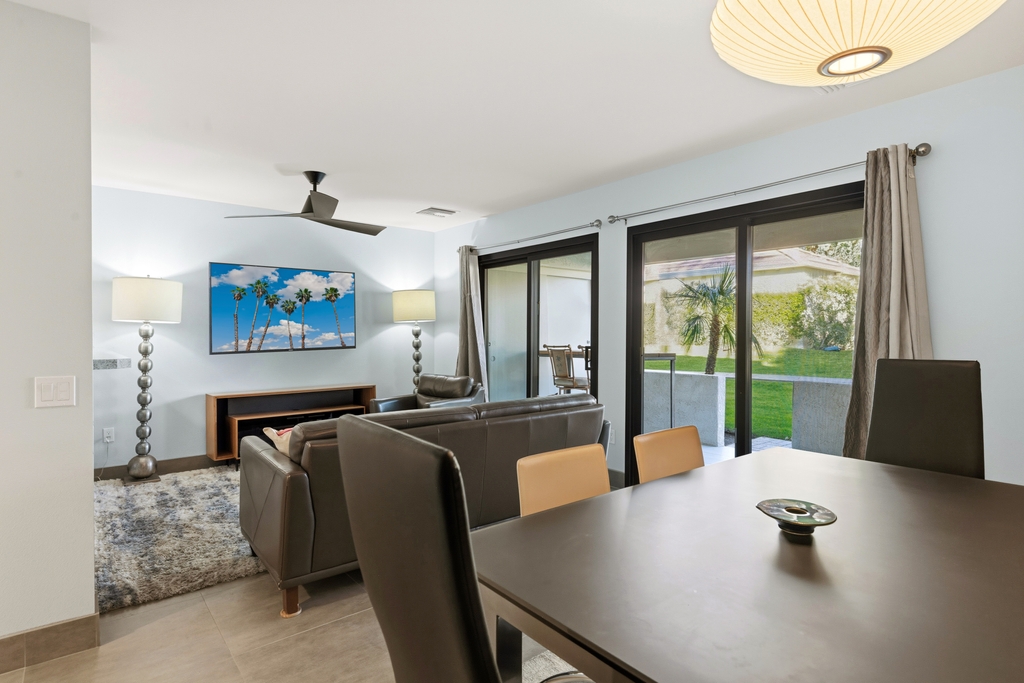 Welcome to this beautifully renovated 1-bedroom, 1-bath ground-floor condo at the highly desirable Riviera Gardens! This end unit is just steps from one of the community's sparkling pools and spas, with convenient covered carport parking nearby. The home has been completely transformed with a comprehensive remodel - the original accordion doors between dining and bedroom were replaced with a proper wall, creating true separation and a dedicated dining space with better privacy and flow. The kitchen features all new stainless steel appliances including dishwasher, microwave, range/oven, and refrigerator, and has been intelligently reconfigured for improved walk-through access. Updated throughout with tile flooring, updated bathroom, expanded bedroom closet, and a walk-in laundry area housing stackable washer/dryer. The living area opens to a private covered patio with green belt views, perfect for relaxing. This gated, resort-style community sits on fee-simple land you own (no land lease!) and offers lush mature landscaping, multiple heated pools and spas, and controlled access. Located minutes from uptown and downtown Palm Springs dining, shopping, and entertainment, yet tucked away in a peaceful setting. Ground-floor convenience, end-unit location, pool-adjacent positioning, and complete updates make this perfect as a primary residence, vacation getaway, or investment property. Move-in ready and waiting for you!