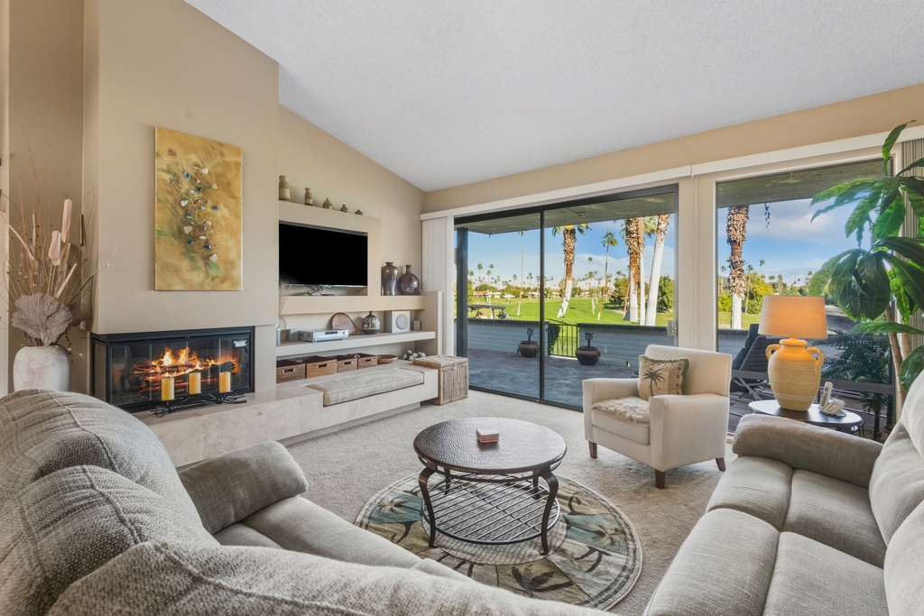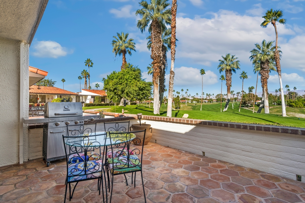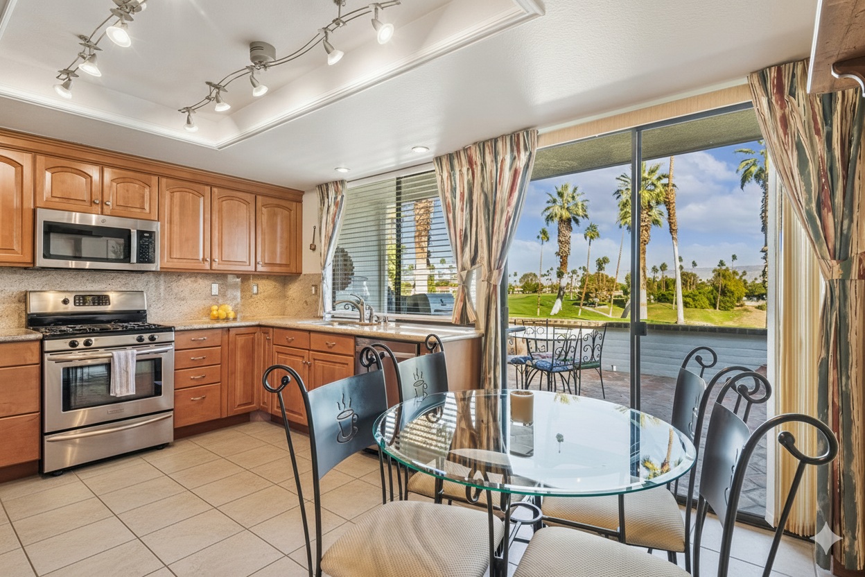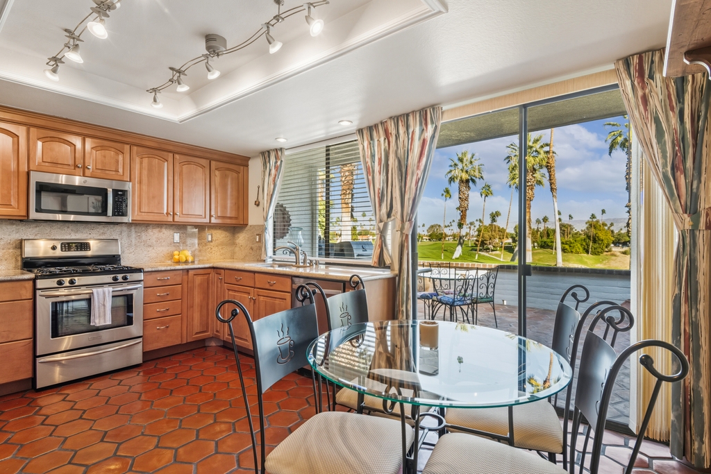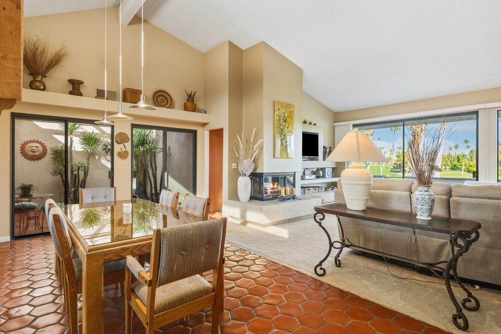 Wake up to sweeping fairway views in this highly desirable 300 plan located in Rancho Las Palmas Country Club in the heart of Rancho Mirage. This 3-bedroom, 2-bath home overlooks the 5th and 6th fairways of the North Course, offering a serene desert golf backdrop from the moment you step inside. Vaulted ceilings and abundant natural light enhance the open living spaces, while the remodeled kitchen shines with granite countertops, updated cabinetry, stainless steel appliances, and recessed lighting perfect for entertaining or relaxed everyday living. A charming interior atrium brings the outdoors in, creating a peaceful retreat at the center of the home. The pool and spa are conveniently located just across the street, and The River shopping center is right outside the gates, with popular restaurants, boutiques, and a movie theater just steps away. This is true desert resort living at its best don't miss the opportunity to experience it in person. Some kitchen photos are digitally altered using AI to show planned new tile flooring; actual finishes may vary.