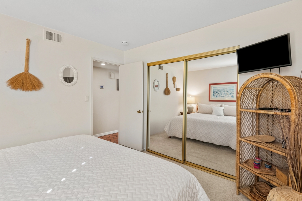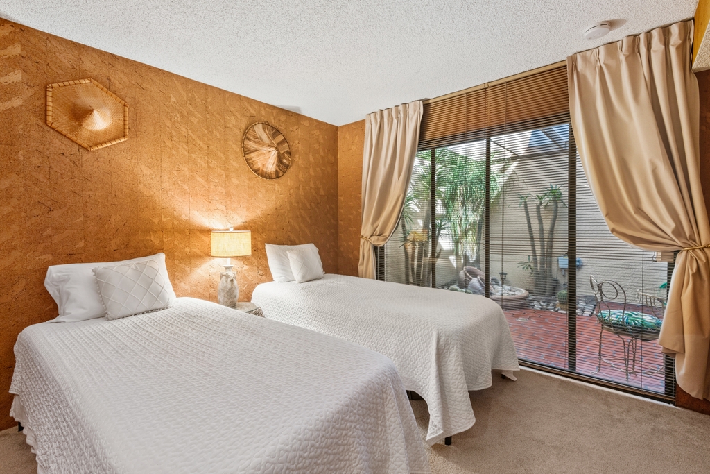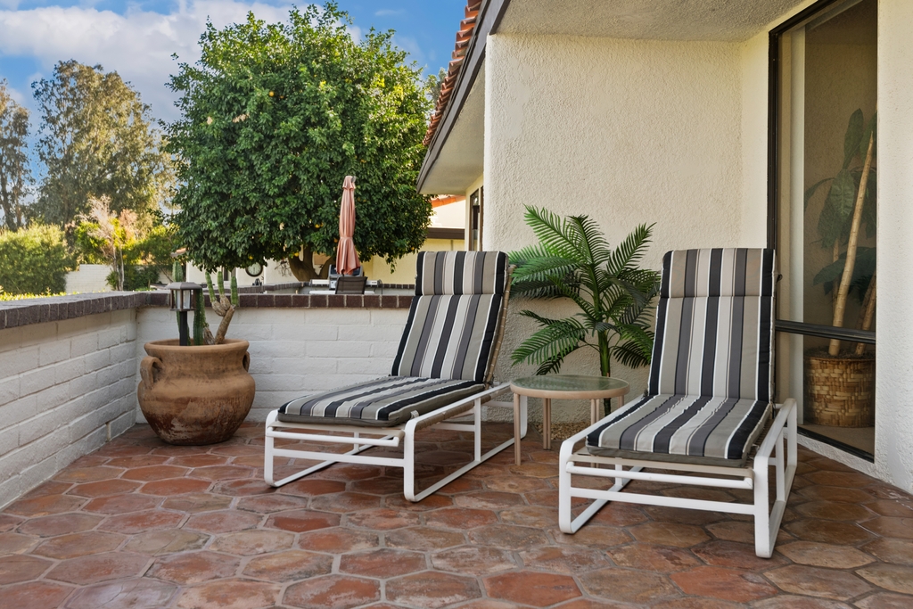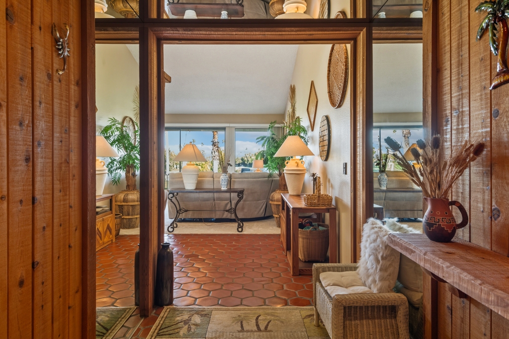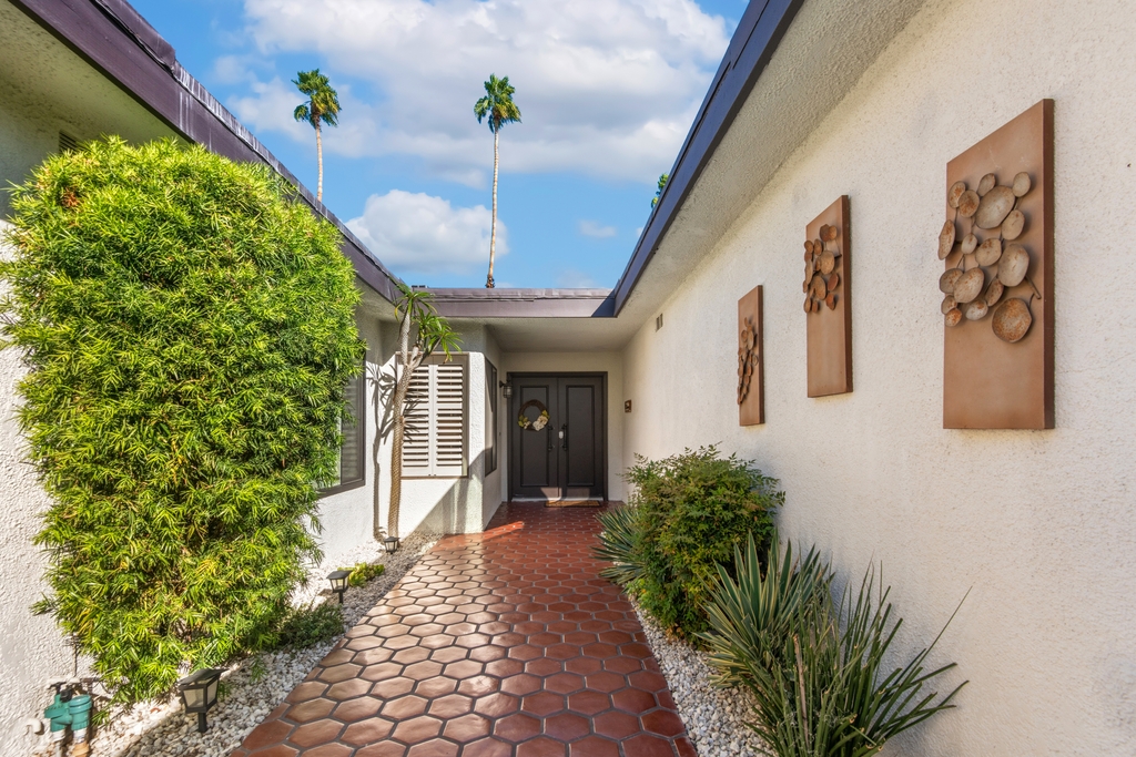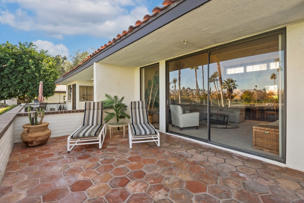 Wake up to sweeping fairway views in this highly desirable 300 plan located in Rancho Las Palmas Country Club in the heart of Rancho Mirage. This 3-bedroom, 2-bath home overlooks the 5th and 6th fairways of the North Course, offering a serene desert golf backdrop from the moment you step inside. Vaulted ceilings and abundant natural light enhance the open living spaces, while the remodeled kitchen shines with granite countertops, updated cabinetry, stainless steel appliances, and recessed lighting perfect for entertaining or relaxed everyday living. A charming interior atrium brings the outdoors in, creating a peaceful retreat at the center of the home. The pool and spa are conveniently located just across the street, and The River shopping center is right outside the gates, with popular restaurants, boutiques, and a movie theater just steps away. This is true desert resort living at its best don't miss the opportunity to experience it in person. Some kitchen photos are digitally altered using AI to show planned new tile flooring; actual finishes may vary.