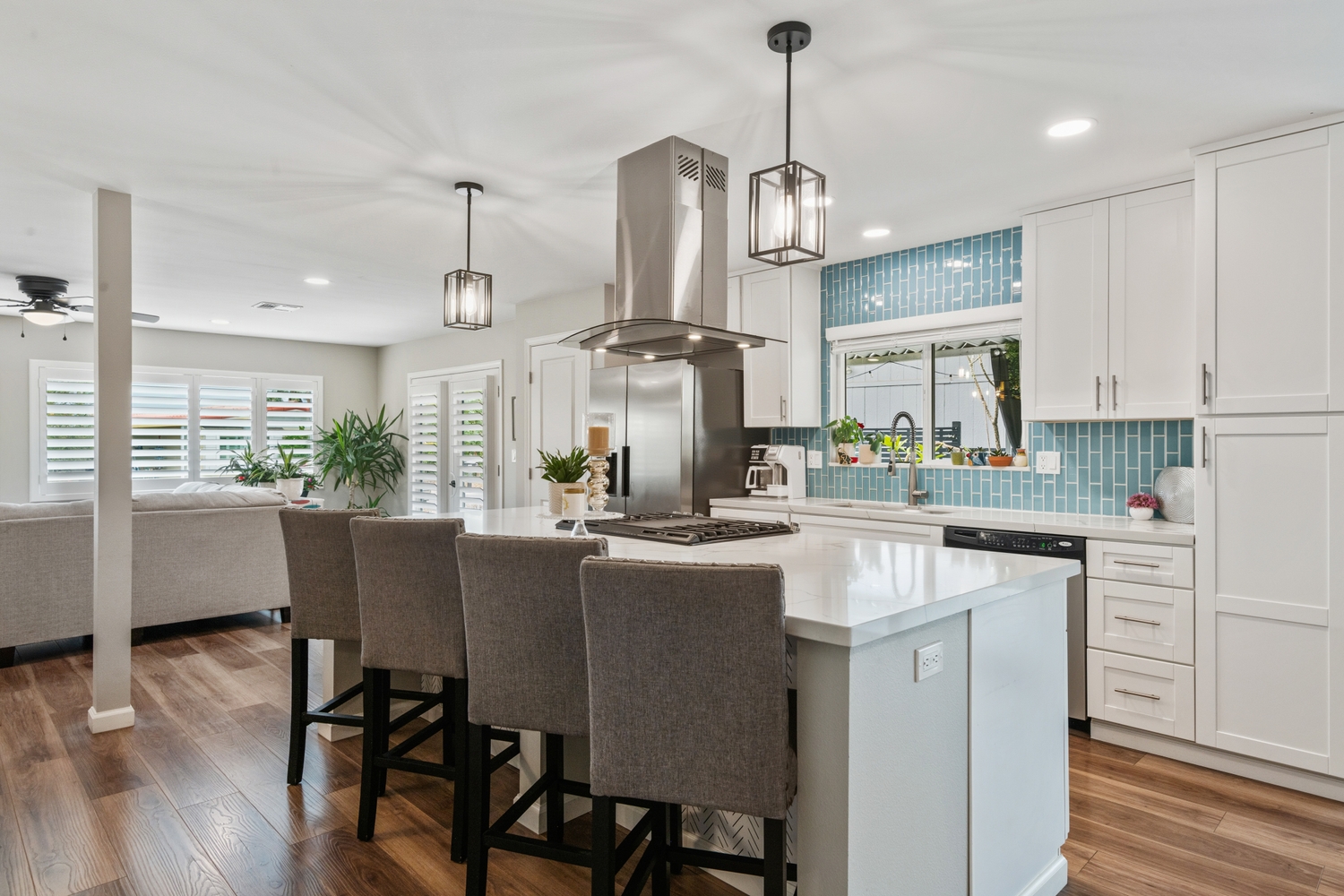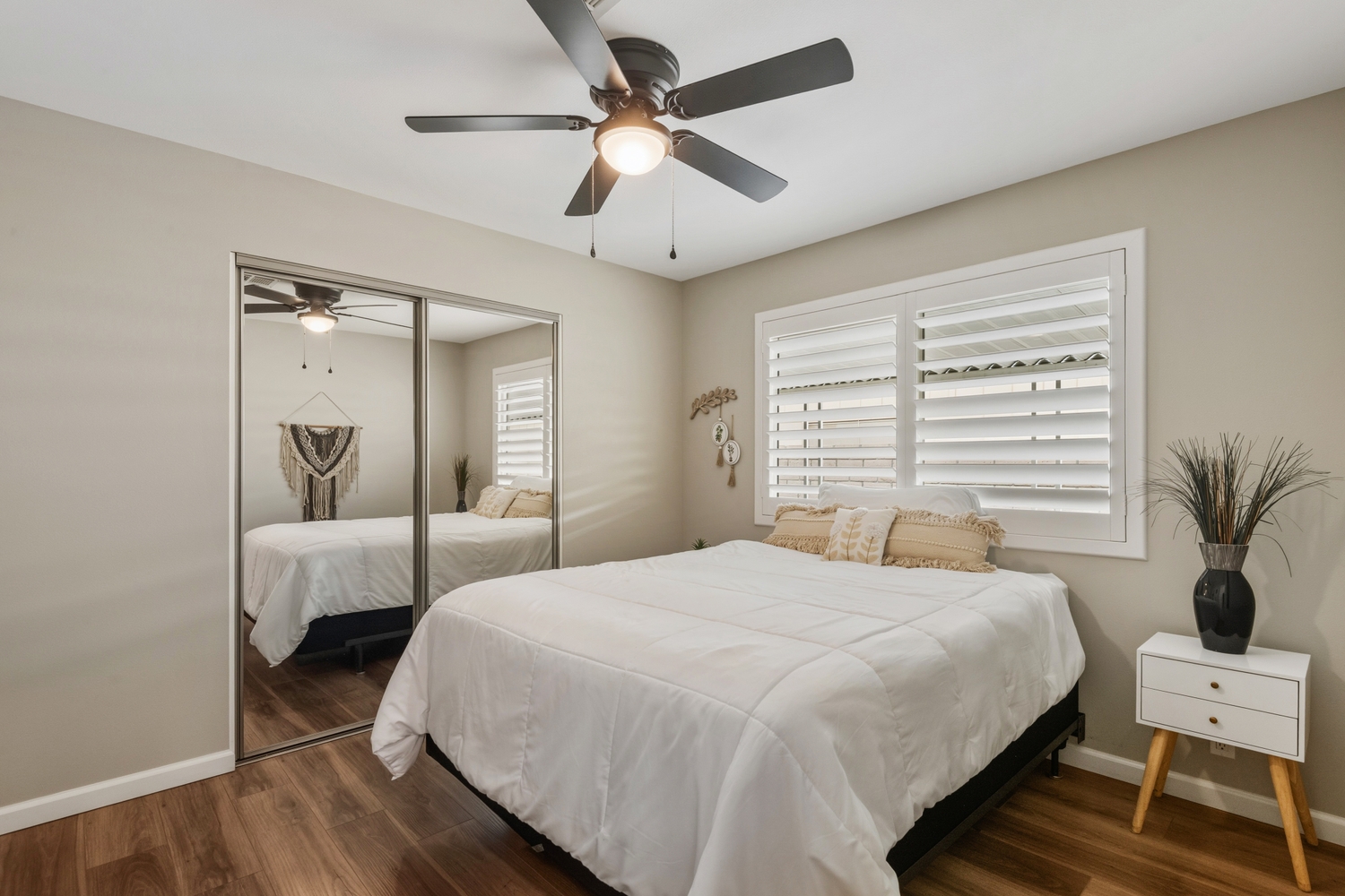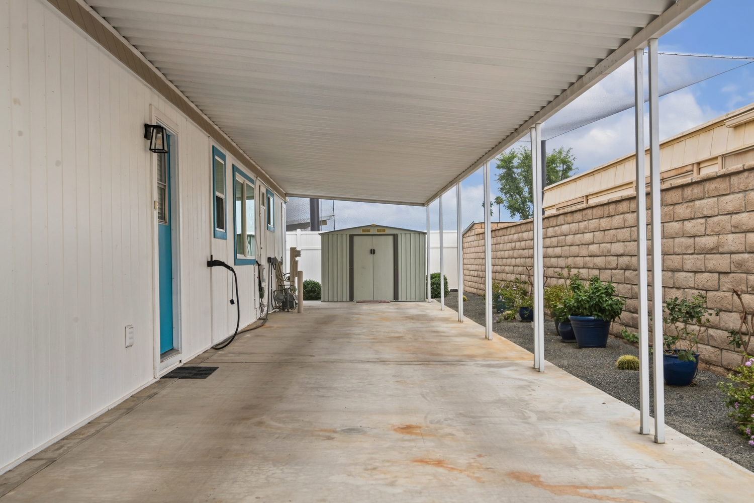Completely remodeled from floor to ceiling, this stunning 2-bedroom, 2-bath manufactured home offers a bright open-concept layout and modern finishes throughout. Features include a glass double-door entry, large covered patio, family room, and a private primary suite with adjoining sitting room or office separated by barn doors. The property has owned solar and a gate in the back that takes you to the community center.The custom kitchen shines with soft-close cabinetry, quartz countertops, stainless steel appliances, farmhouse sink, colorful tile backsplash, and seating for four. Additional upgrades include 12mm plank laminate flooring, new drywall, dual-pane windows, recessed lighting, new interior doors, mirrored closets, and fresh interior/exterior paint. Primary bath features dual sinks and an oversized custom tiled shower.Located in Desert Greens, offering free golf, security, clubhouse, cable, internet, and active social clubs--all included with low HOA dues.