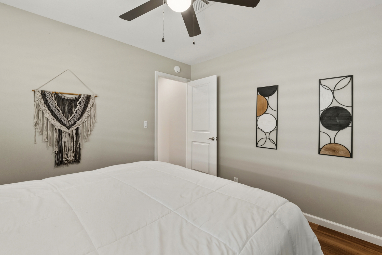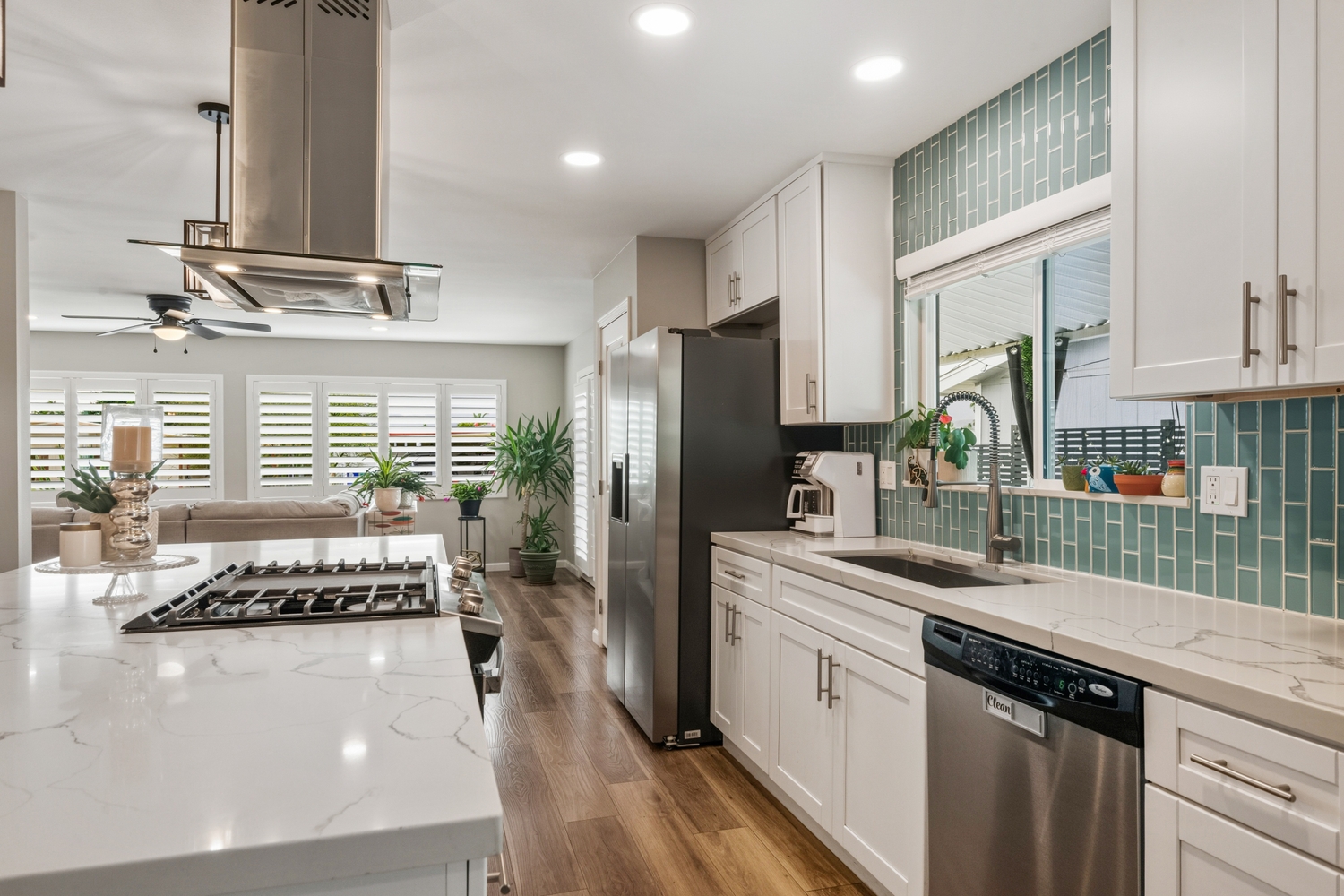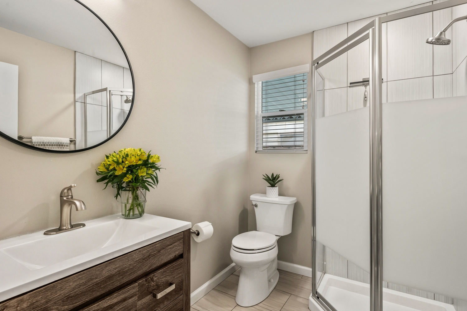 Completely remodeled from floor to ceiling, this stunning 2-bedroom, 2-bath manufactured home offers a bright open-concept layout and modern finishes throughout. Features include a glass double-door entry, large covered patio, family room, and a private primary suite with adjoining sitting room or office separated by barn doors. The property has owned solar and a gate in the back that takes you to the community center.The custom kitchen shines with soft-close cabinetry, quartz countertops, stainless steel appliances, farmhouse sink, colorful tile backsplash, and seating for four. Additional upgrades include 12mm plank laminate flooring, new drywall, dual-pane windows, recessed lighting, new interior doors, mirrored closets, and fresh interior/exterior paint. Primary bath features dual sinks and an oversized custom tiled shower.Located in Desert Greens, offering free golf, security, clubhouse, cable, internet, and active social clubs--all included with low HOA dues.